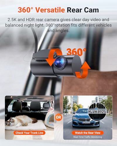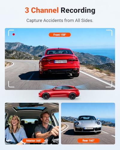 [ 3 Channel Dash Cam ] The N4S dashcam simultaneously records your vehicle’s front, inside, and rear in 2.7K+1440P+1440P resolution using ultra-wide-angle lenses (158°+165°+160°) for 360° coverage, to stop hit-and-runs, theft, and vandalism from every angle.