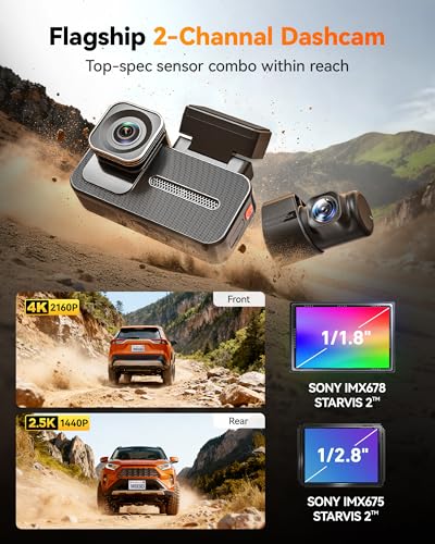[4K 30FPS + 2.5K 30FPS High-Resolution Dash Cam] The X5 Duo dual dash cam front and rear is equipped with flagship-level Sony IMX678 and IMX675 sensors for exceptional image performance. This 2-channel car dash camera records crisp 4K 30FPS front and 2.5K 30FPS rear video, delivering rich detail in low light, tunnels, and shaded roads. License plates and road details remain clear and easy to identify. Suitable for sedans, trucks, pickups, SUVs, and vans.